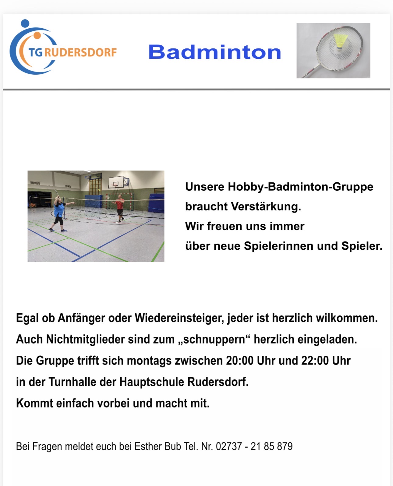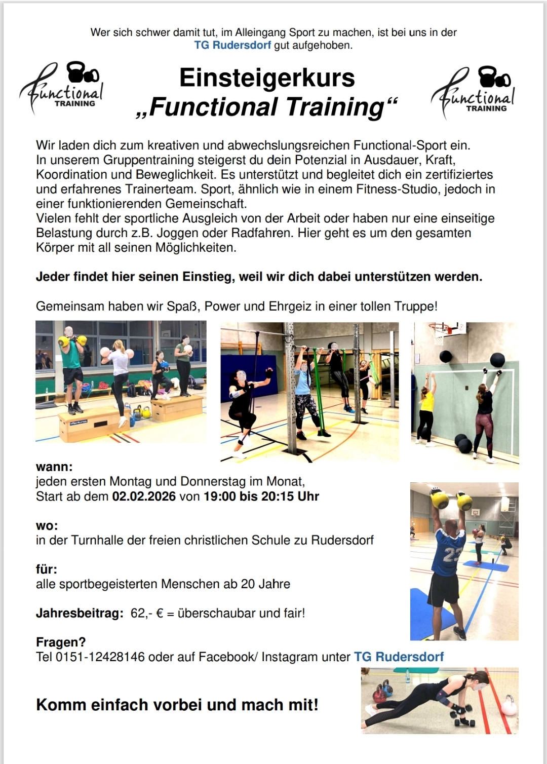 Tel 0151-12428146 oder auf Facebook/ Instagram unter TG Rudersdorf